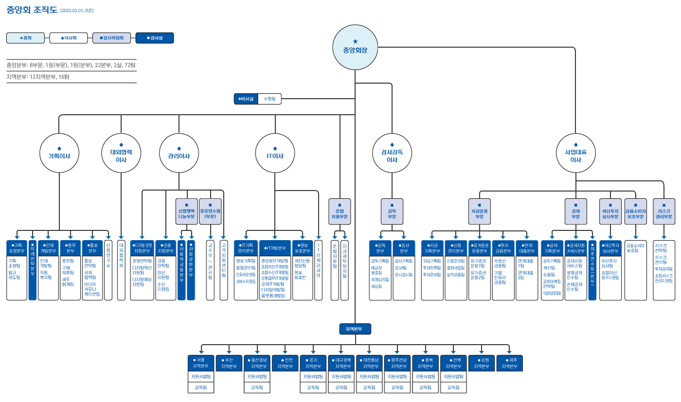 중앙본부 : 8부문, 1원(부문), 1원(본부), 22본부, 2실, 72팀