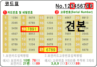 2. 시행일 : 2006. 2. 24(금) 3. 적용매체 : 인터넷뱅킹,인터넷지로,텔레뱅킹,모바일뱅킹,공인인증 4. 자금이체시 보안카드 사용 방법 전자금융을 통한 자금이체시 지시 보안카드 번호 앞의 두자리와 뒤의 두자리를 각각 입력하셔야 합니다. 5. 공인인증서 발급시 보안카드 고유번호(Serial-Number) 사용방법 전자금융을 통한 공인인증서 발급시 보안카드의 우측상단의 번호 중 제시하는 번호를 입력하셔야 합니다. 입력 예) |  | ① 자금이체시 보안카드 입력 예 질문 : "10번 앞의 두자리" "21번 뒤의 두자리" 입력 : 10번 해당자리 "78" 21번 해당자리 "89" ② 공인인증서 발급시 고유번호 입력 예 질문 : 보안카드고유번호 3번째, 8번째, 9번째 입력 : "3", "8", "9" | |