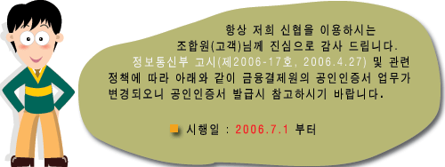 | 구 분 | 변경내용 | | 범용공인인증서 | - 2006. 7. 1부터 2006. 6. 30까지 금융결제원 범용 인증서 가입 조합원(고객)에 대해서만 동 인증서의 발급(갱신, 재발급 포함)서비스가 제공됩니다. - 따라서, 2006. 7. 1 이후 금융결제원 범용공인인증서 신규발급이 중단됩니다. ※ 신규 조합원(고객):2006년 7월 1일 이전에 금융결제원 범용 인증서를 전혀 발급받은 적이 없는 조합원(고객) - 인터넷뱅킹, 보험업무를 위해 공인인증서를 발급받고자 하실 경우 '은행/보험용 공인인증서'를 발급 받으실 수 있습니다.(개인:무료,법인:4,400원)