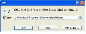 | ① 시작 → 실행 → hosts 파일 위치입력 후 확인 클릭 |
