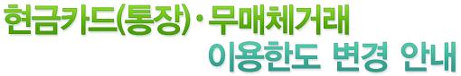 | 이용매체 | 이용구분 | 변경전 | 변경후 | | 1회 | 1일 | 1회 | 1일 | 현금카드 (통장) | 인출 | 현금 | 70만원 | 700만원 | 70만원 | 600만원(통합) | | 수표 | 100만원 | 700만원 | 100만원 | | 계좌이체 | 1,000만원 | 5,000만원 | 600만원 | 3,000만원 | 무매체 거래 | 인출 | 현금 | 70만원 | 300만원 (통합) | 70만원 | 200만원(통합) | | 수표 | 100만원 | 100만원 | |