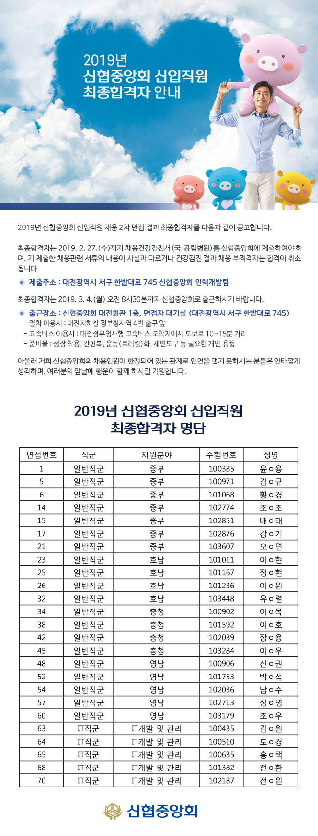 2019년 신협중앙회 신입직원 채용 최종합격자 공고